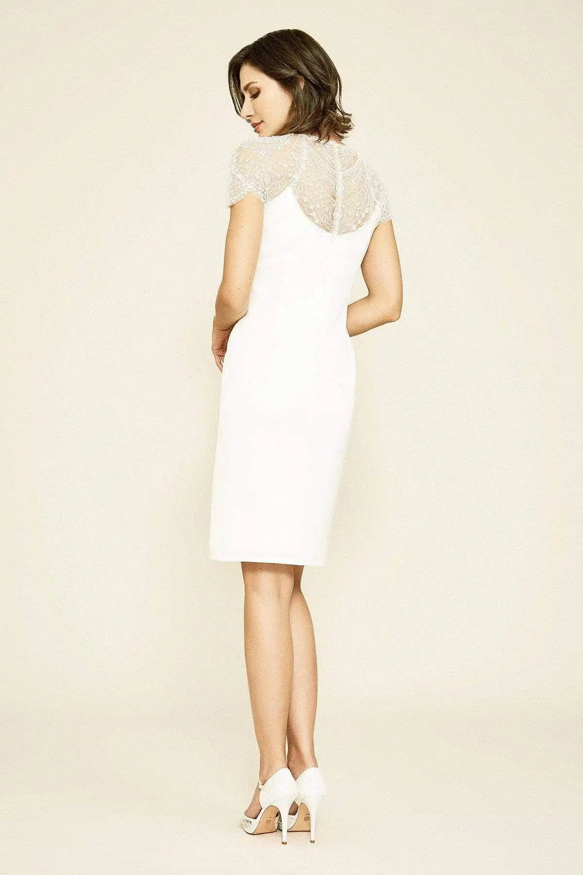 Envisions in a jewel neckline with sleeves. The fitted bodice and sleeves are ornate with embellishments and completes the look in a knee length mid-thigh skirt.