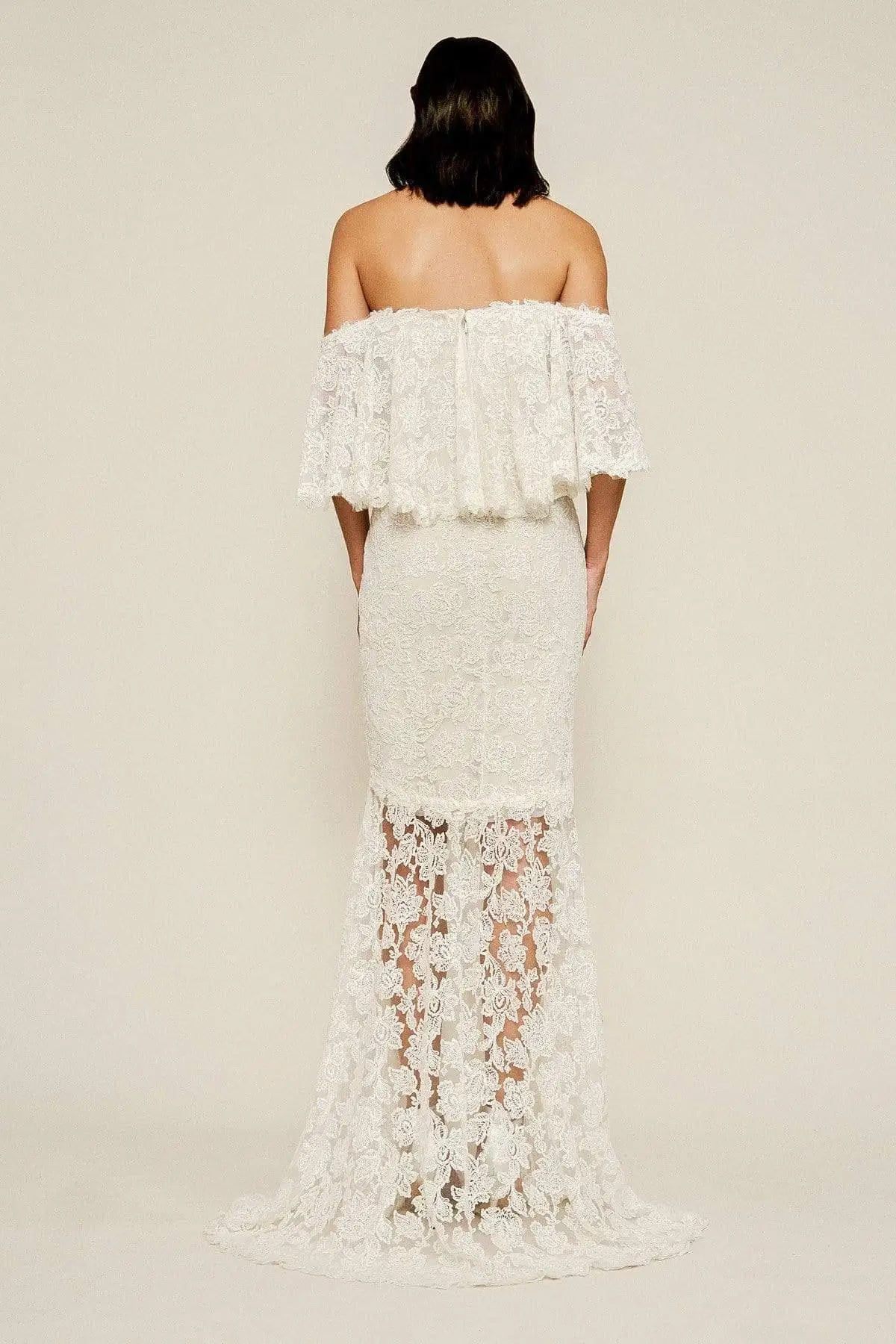 | Details: | Embroidered tulle, Off-shoulder sleeves, Fitted bodice, Trumpet skirt, Sweep train, Back zipper |