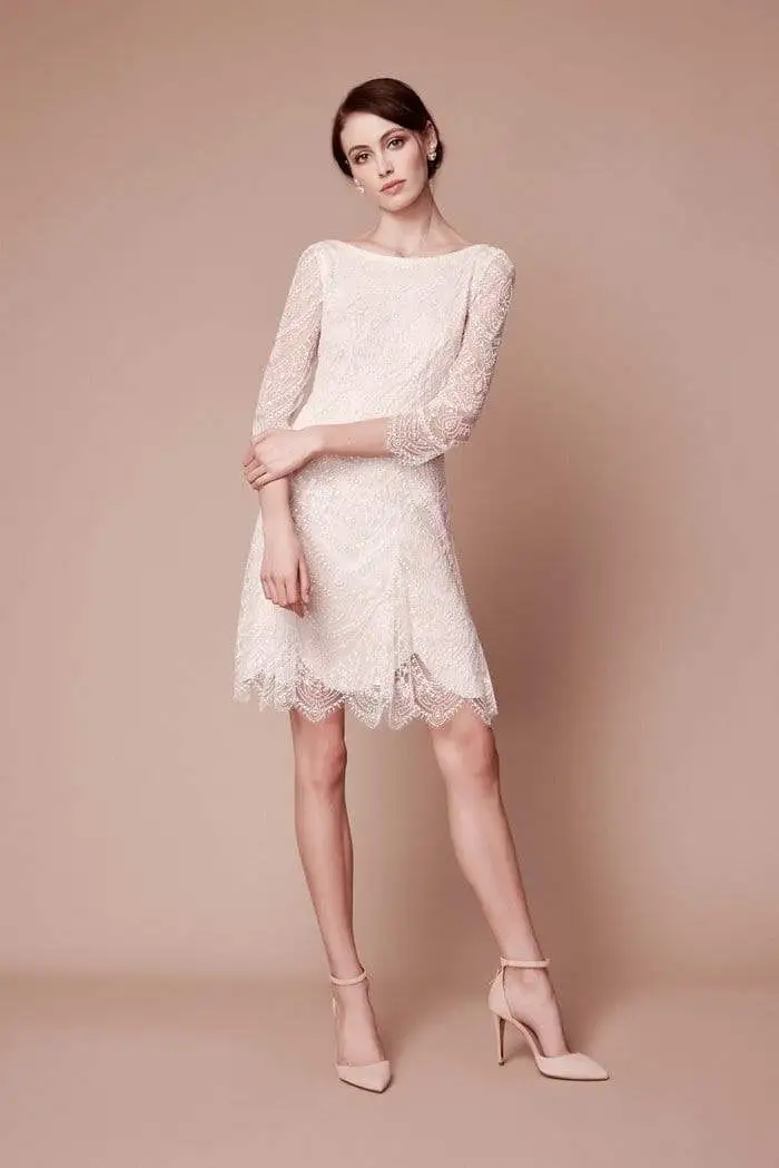 | Details: | Quarter length sleeves, Embroidery, Fitted bodice, A-line skirt, Scalloped hemline, Center back invisible zipper, Pearls |