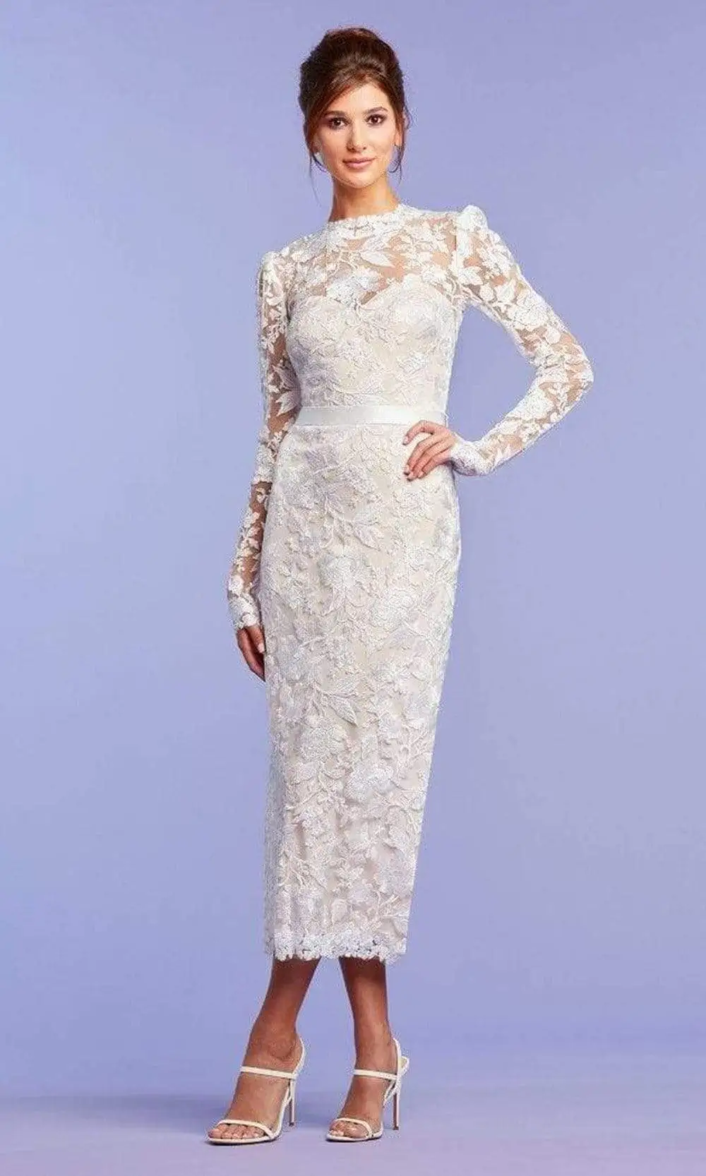 Shine with the glow of love on your wedding day in this Tadashi Shoji BRX21047MDBR creation. Intricately embellished with embroidered details, this bridal dress charms with an illusion high neckline with long sleeves. Accented with a cutout back, this stunner also parades a satin waistband. The skirt skims into a tea length hemline. Demand undivided attention in this Tadashi Shoji masterpiece.