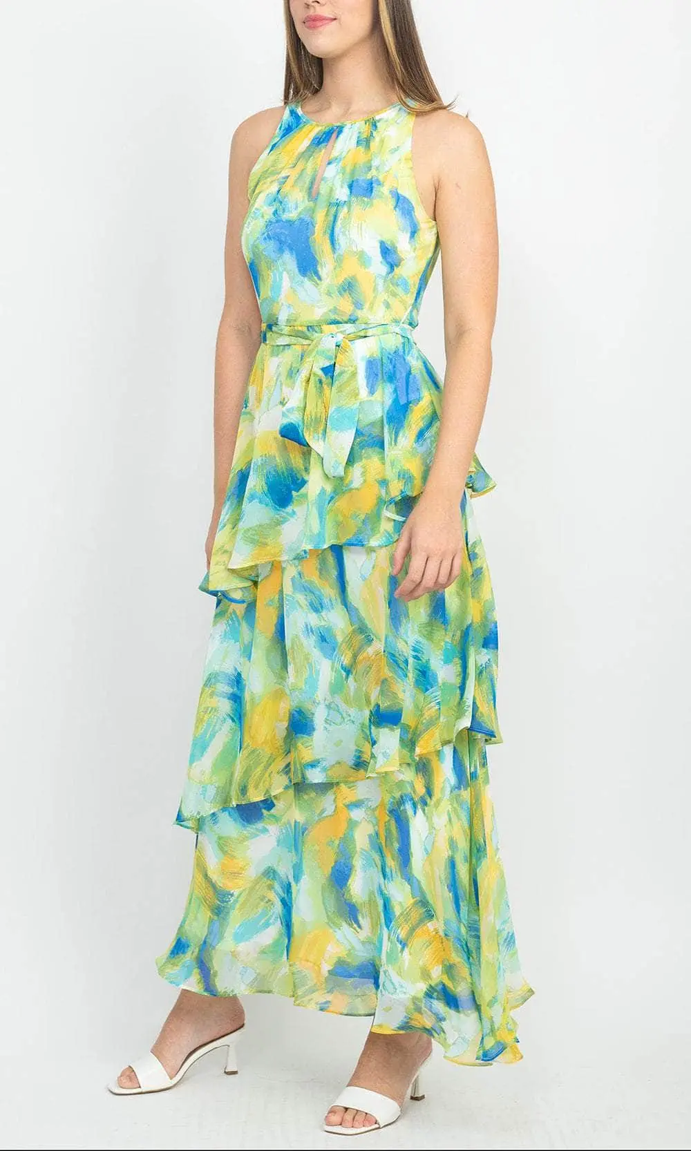 | Details: | Sleeveless, Front Keyhole, Printed, Tiered, Tie Waist, Full Back, Back Zipper |