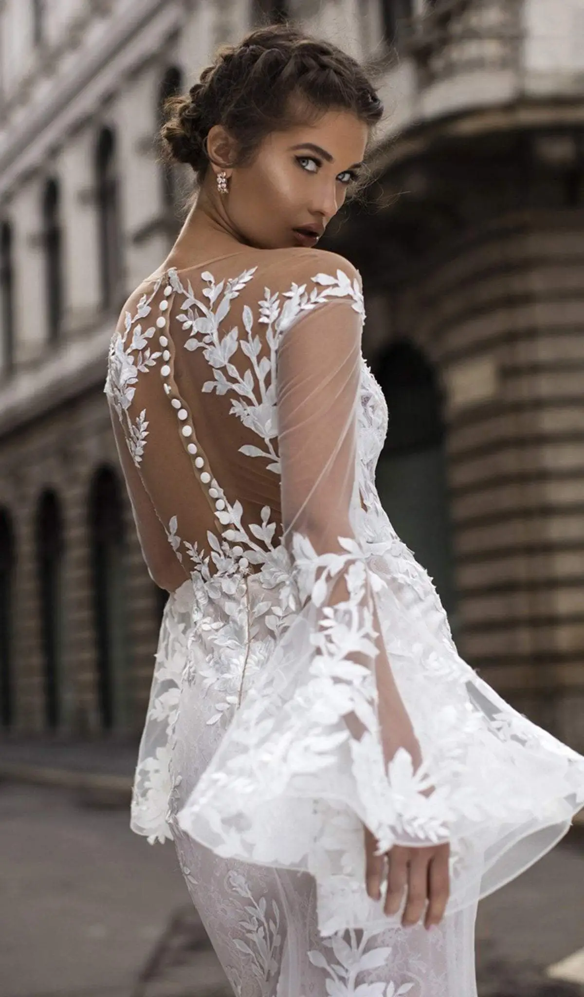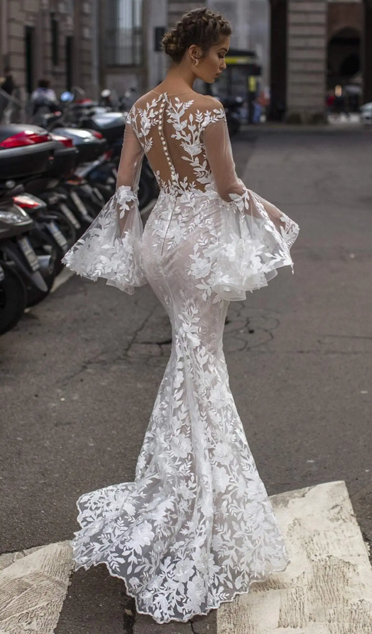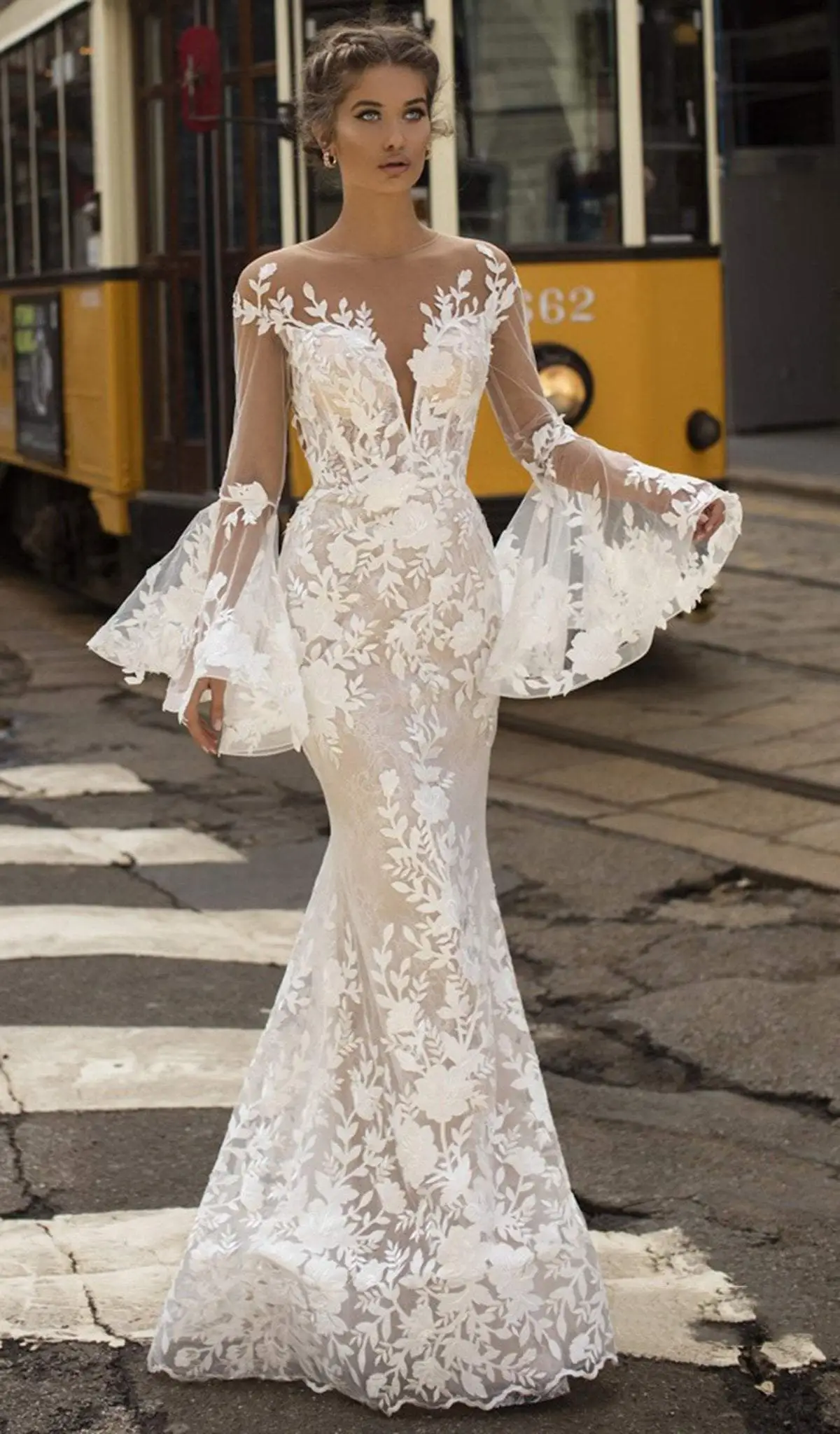 | Details: | Long bell sleeves, Floral lace, Fitted bodice, Sheer fabric, Mermaid skirt, Covered buttons, Train, Scalloped hemline |