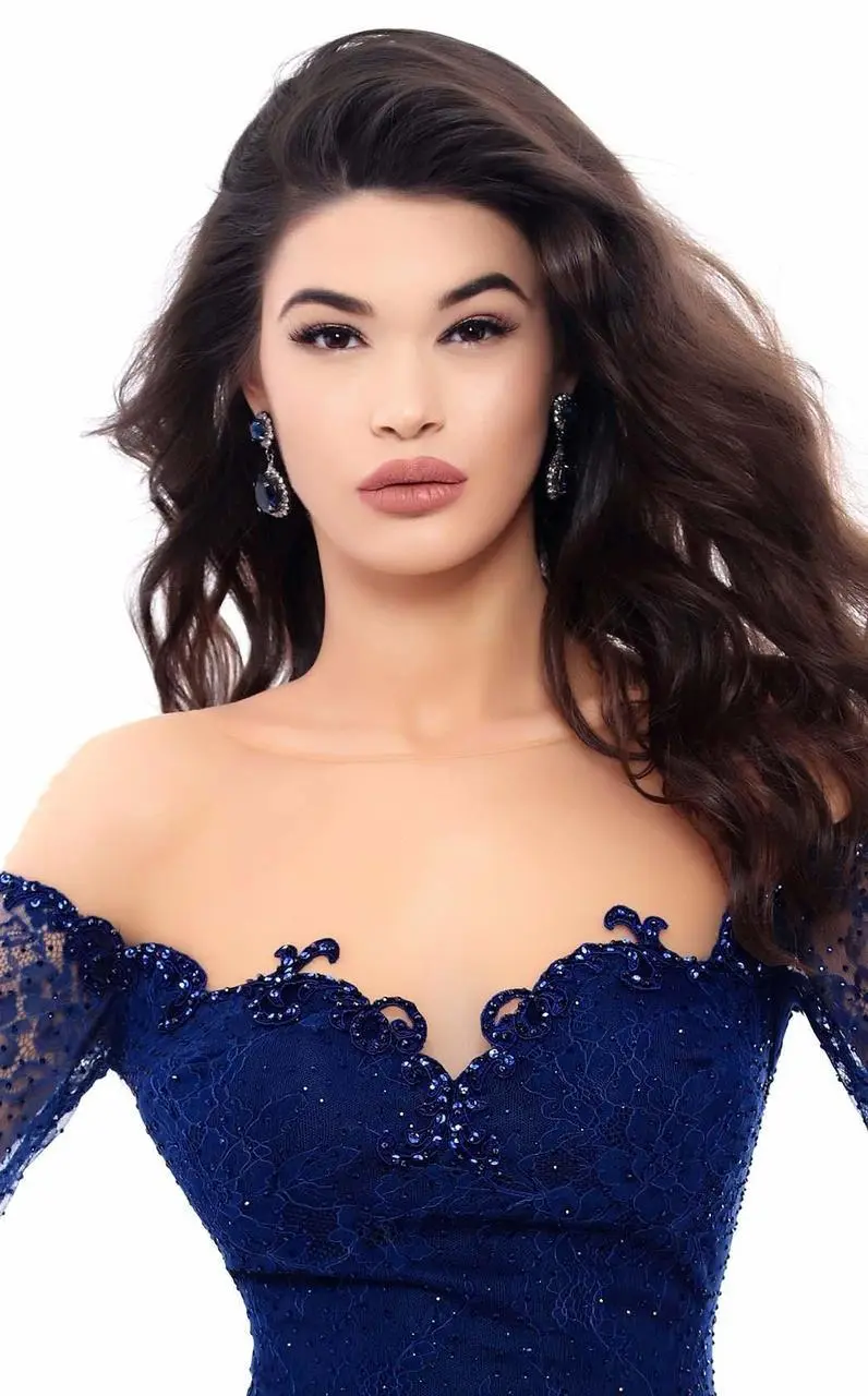 Be that fascinating beauty that charms them with her elegance in this Tarik Ediz 93329 creation. Elegantly ornamented with delicate lace sprinkled with shimmering jewels, this fabulous piece flatters with a bateau illusion over a scalloped sweetheart neckline. Framed with an off-shoulder style, this ensemble has long, lacy split sleeves that flows in a lengthy cascade. Twinkling appliques accents the sculpted knee-length sheath silhouette. Make them stare in awe at your exceptional style in this glorious Tarik Ediz masterpiece. Model is wearing the Navy color.