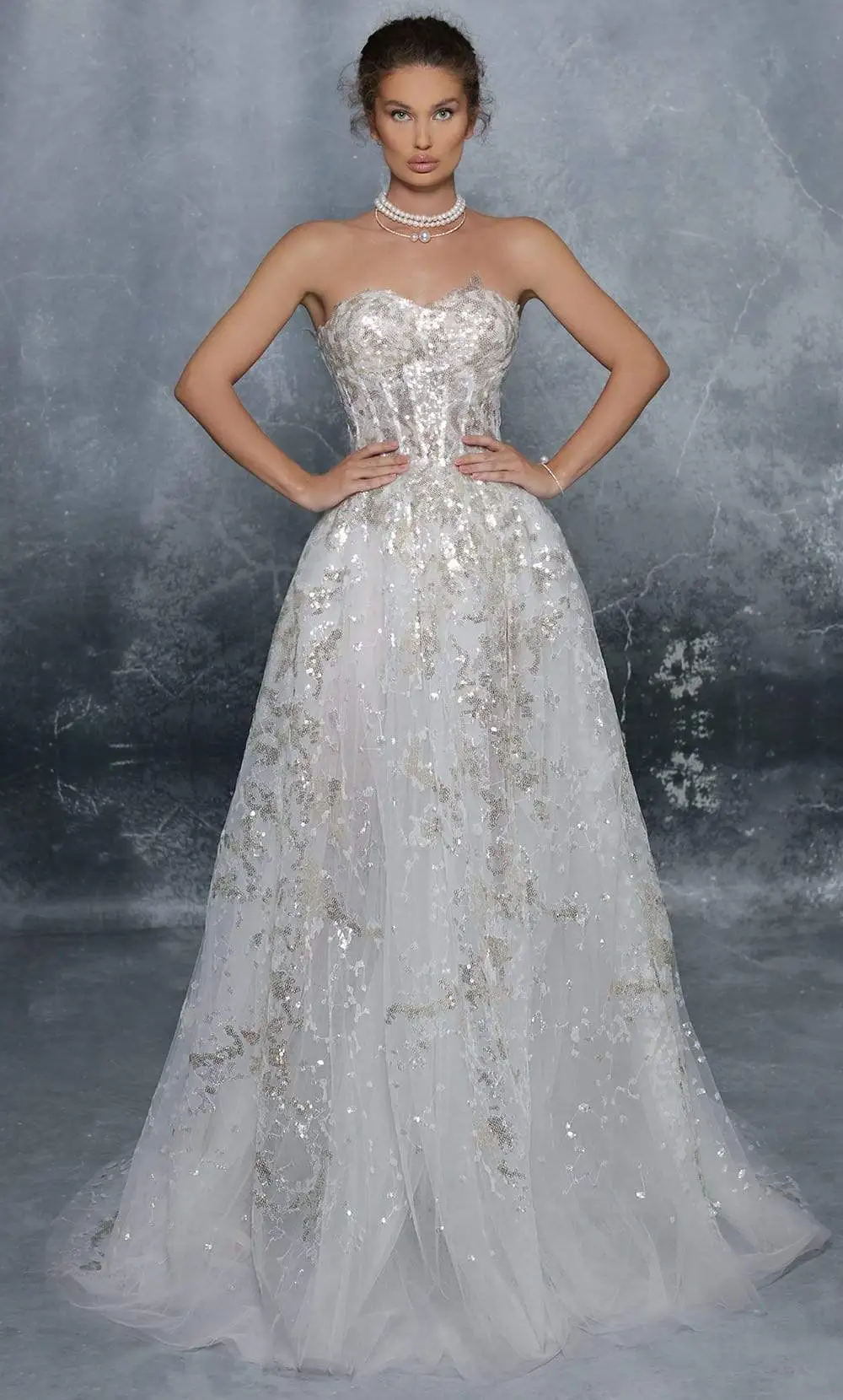 Glow with opulence in this Tarik Ediz 966036 creation. Exquisitely embellished with sequins allover its length, this gown features a strapless sweetheart neckline with a midrise back. Corset boning accent the illusion bodice. The A-line skirt parts with a high slit as it trails into a sweeping train. Be enamored by the beauty of this Tarik Ediz masterpiece. Model is wearing the Ivory/Gold color.