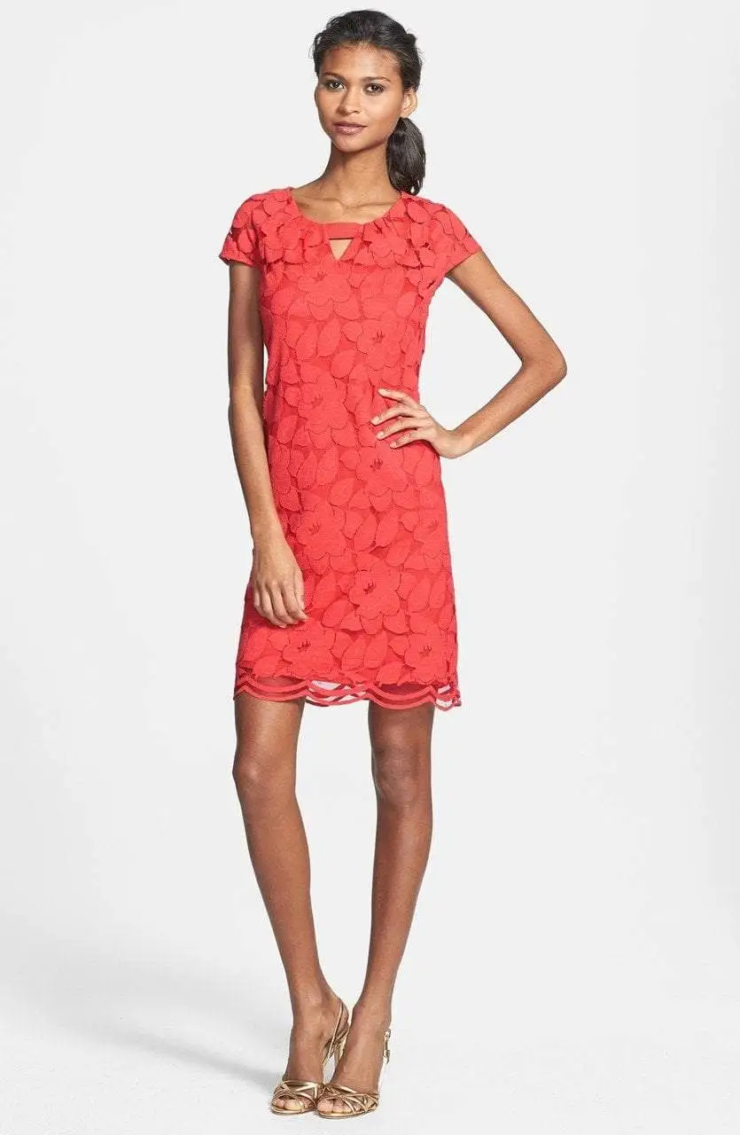 Make them stop and stare in regal elegance in this beautiful Taylor 5448M creation. Overlaid with an intricate floral and leaf patterned lace on a cotton underlining, this attractive piece has a jewel neckline designed with subtle ruching and accented with a triangular keyhole cutout. Framed with sheer cap sleeves and a keyhole cutout on its full back, the sheath skirt flows along every contour with a feminine grace and completes at a scalloped short hemline. Fascinate from all angles with your charming style and poise in this Taylor masterpiece.