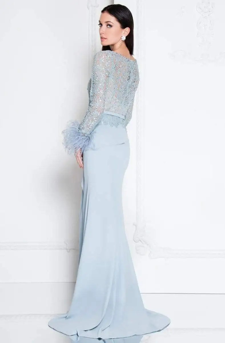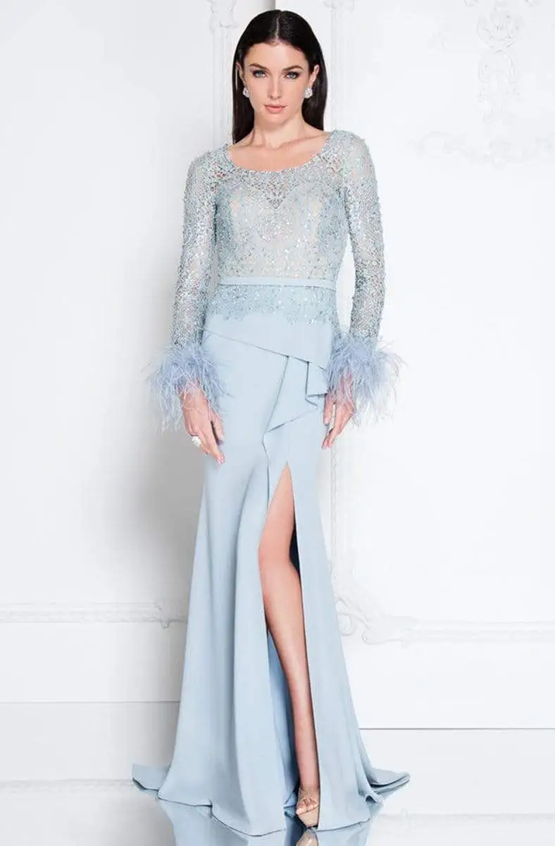 Enter the party and do that walk of a regal beauty in Terani Couture 1811M6568. This dress features sheer long sleeves with feathered cuffs. The scoop neckline bodice has a sweetheart lining ornate with embellishments. The waist is framed in a thin belt and leads to a full length sheath skirt with slit and sweep train. Terani Couture is a charming choice for your next special occasion. Model is wearing Powder Blue Nude color.
