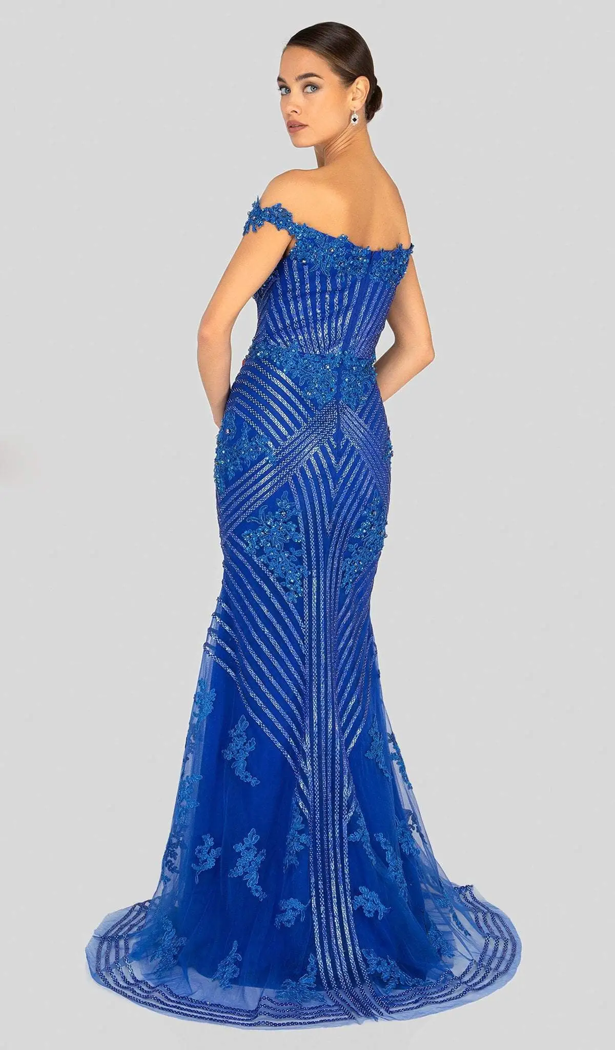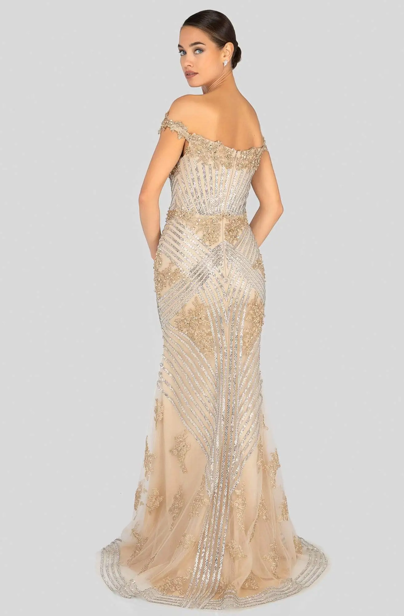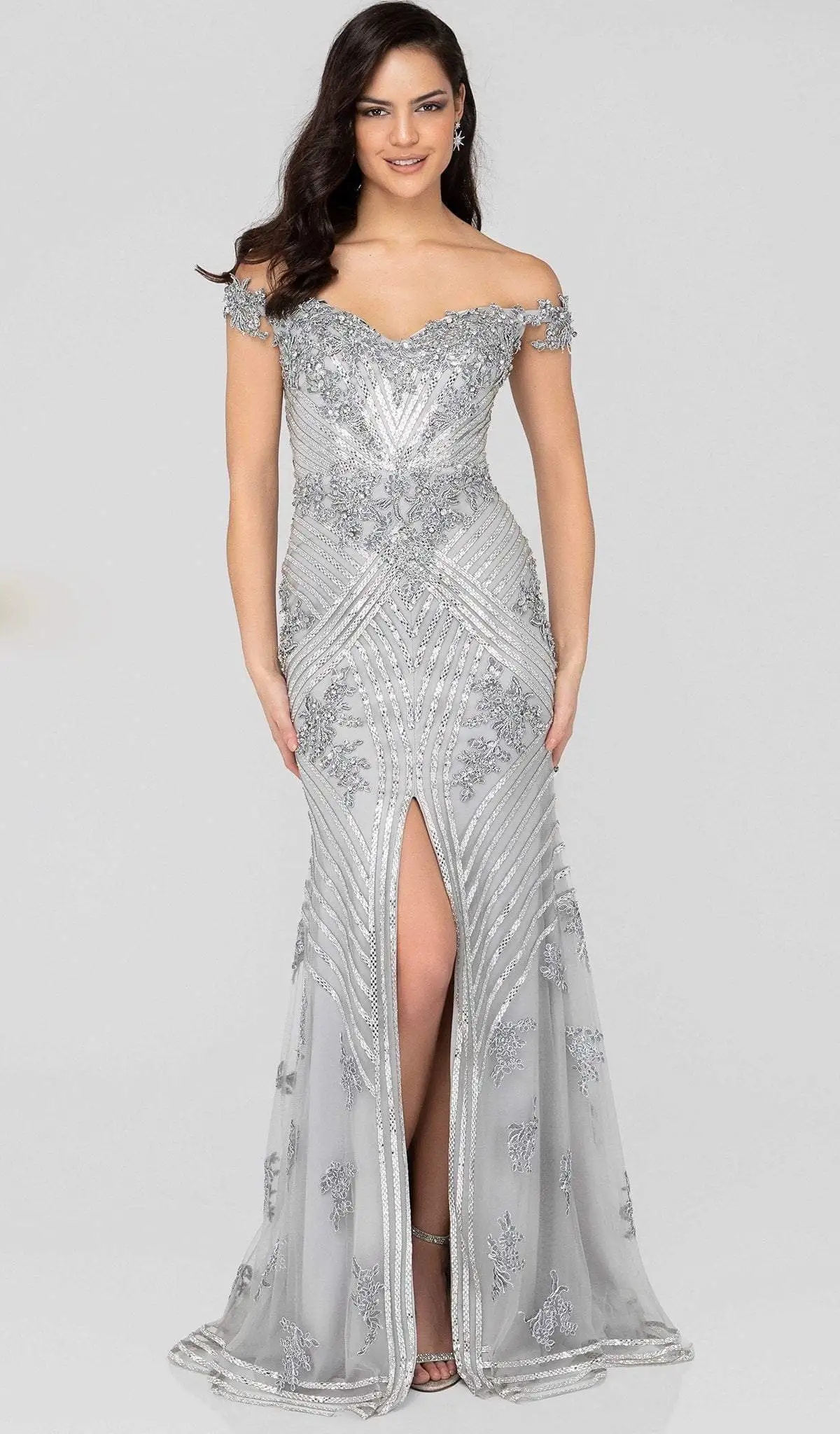 Exude that sparkling personality in this stunning dress by Terani Couture 1912GL9572. This off-the-shoulder glittering dress is lavishly wrapped in an overlay fitted bodice, embellished with beaded lace applique and similar shimmering details through the skirt. This figure flattering ensemble, skims the hips and ends with a ravishing finish at floor length complete with a thigh high front slit. This Terani Couture style is the perfect special event outfit for the girl who wants to stand out from the crowd while looking glamorous. Model is wearing Silver color. Find more prom dresses!