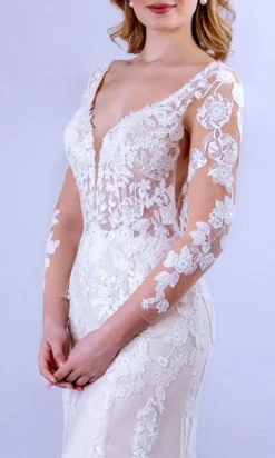 | Details: | Off-shoulder sleeves, Fitted bodice, Floral accents, Embellishments, Mermaid skirt, Slit, Sweep train |