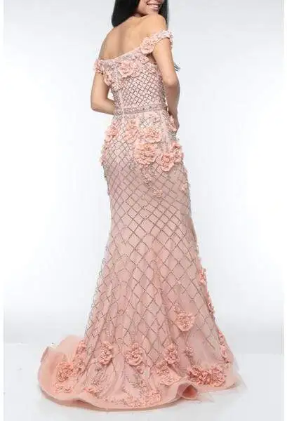 You are certain to capture the hearts and attention of everyone at your special event. This Terani 1922GL0682 evening dress is our special offer to you. This stunning dress makes you feel complete, confident, and comfortable. It’s 3D floral embellished net designed fabric, the eye-catching design and finally, the artistic tailoring of it makes you absolutely in love with this spectacular style. This beautiful dress features an embellished off-shoulder, deep open sweetheart neckline, embroidered bodice, exposing the beauty and soft skin of the upper body, especially the neck, collarbone, and shoulders, it continues to the back of the dress with fascinating cover, going to the snugged waistline of the dress, containing the hips, falling down to a hugging caressing embellished mermaid long skirt, with a stunning queen silhouette adding a Cinderella vibe to the whole perfect style of it.