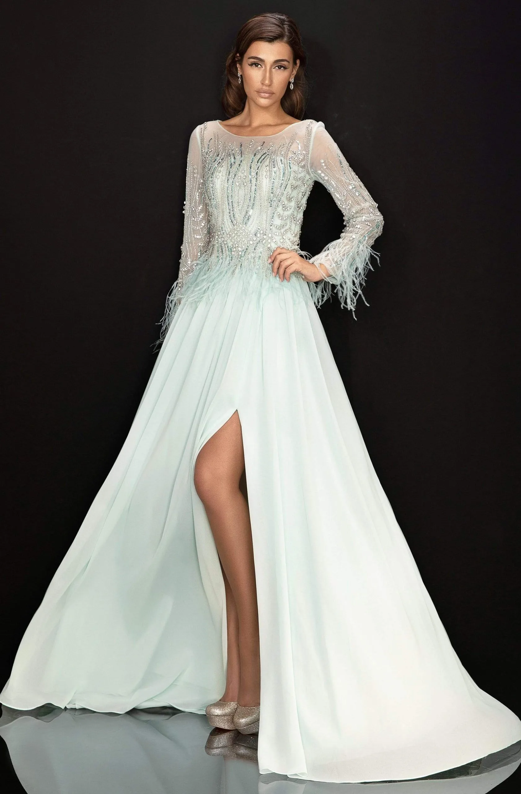 Clothe yourself in creative couture with this stunning Terani Couture 2011M2163 evening dress. The fitted bodice is intricately designed with sequin embellishments framed with an illusion bateau neckline and slender sheer long sleeves. Feathery fringe accent the edge of the sleeves and waist as it gives way to the pleated a-line skirt adorned with fabulous pleats and slit. The a-line silhouette cascades to the floor and finishes with a sweep train. Elegant and alluring, this sophisticated Terani Couture dress is ready to shine at any event. Model is wearing Mint color.