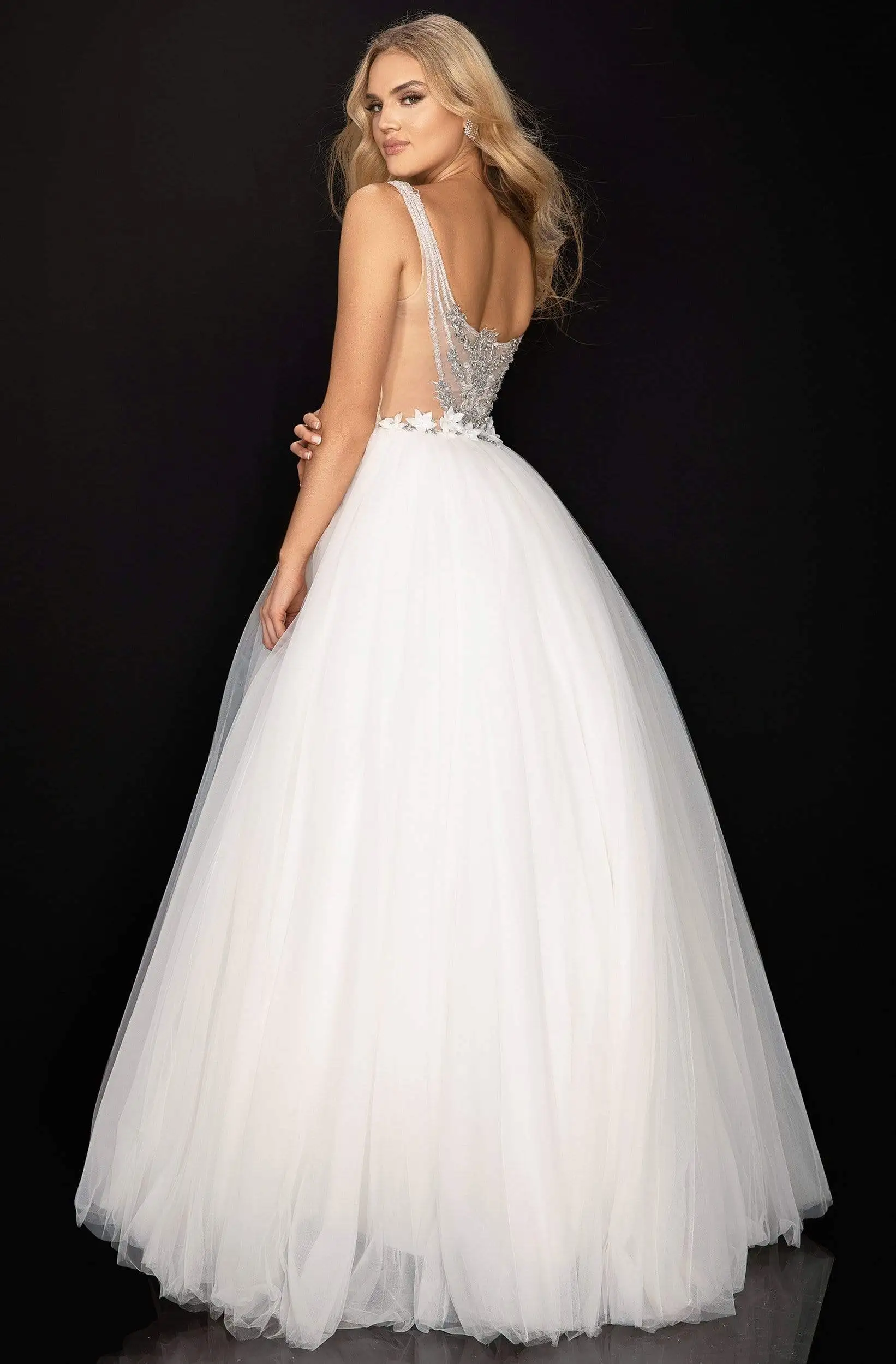 | Details: | V-Neckline, Ruching Detail, Floral Waist and Shoulder, Scoop Embellished Sheer Back, Ballgown |