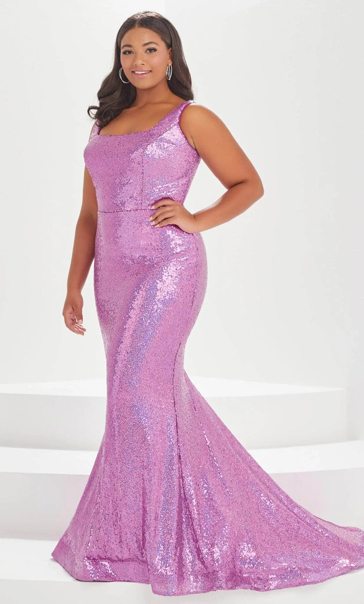 Infuse your special event with stellar style in this Tiffany Designs by Christina Wu 16037 creation. Mesmerizingly ornate with sparkling, iridescent sequins, this dazzling gown features a sleeveless and square neckline. The fitted bodice is held by supporting straps that leads to an open back revealing a low-cut style. The skirt is gorgeously tailored in sheath silhouette as it cascades to a dramatic train, finished with a zipper closure at the back for a perfect fit. Surprise the crowd as you wear this exceptional masterpiece from the Tiffany Designs by Christina Wu 16037 collection. Model is wearing Sky, and Violet colors.