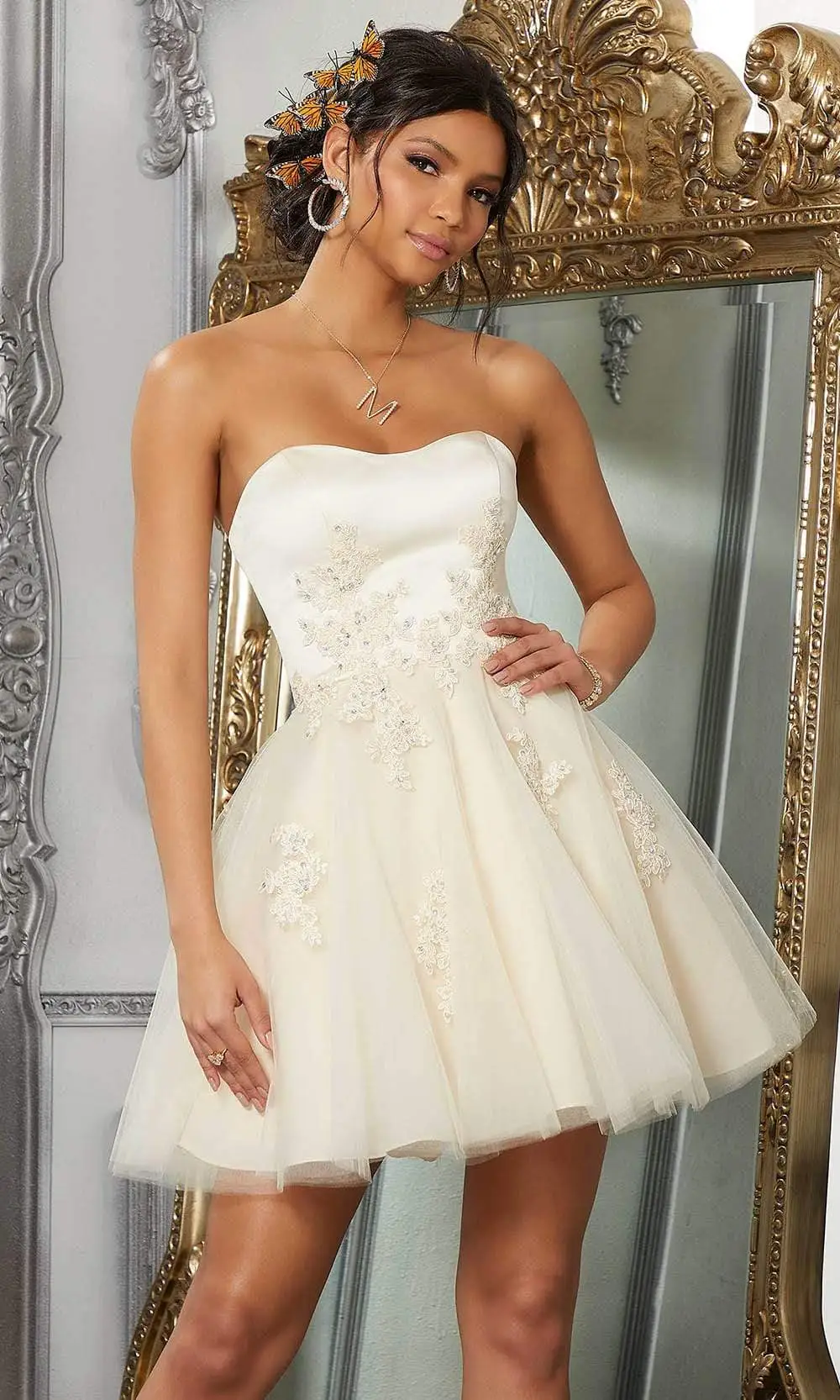 Dress to impress on your next formal event in this simple but captivating dress from Vizcaya by Mori Lee 9575. This charming dress features a strapless, sweetheart neckline with a fitted bodice ornate with beaded lace. It has a lace up back that gives your bodice that fitted look. The tulle skirt opens in a sassy, mid-thigh A-line silhouette. This Vizcaya by Mori Lee dress is sure to make you the darling of the party! More colors available. Please call our sales team at 855-700-4239.