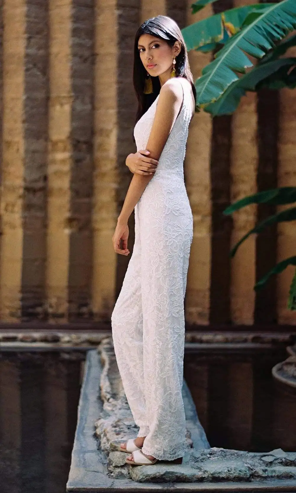 This sleeveless jumpsuit features scalloped edge V cut neckline and low V shaped back, fitted lace overlay bodice and fitted leg pants. Paired with sparkling peep toe heels, this chic Bridal jumpsuit is for the fashion-forward bride who wants to make a statement on her big day!